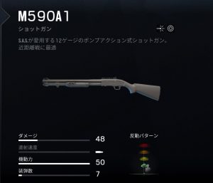 ポンプアクション式のショットガンで1発の威力が高く、近距離戦にとても強い武器です。