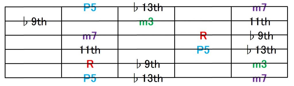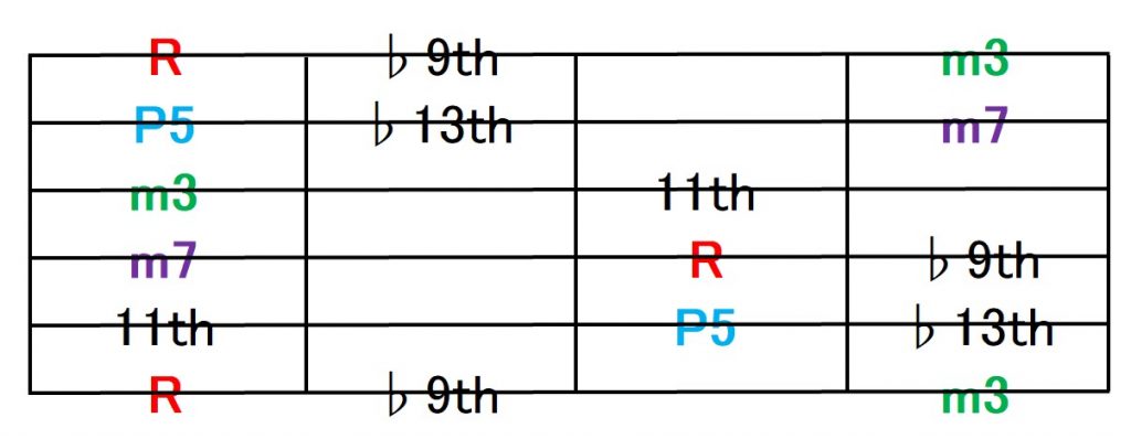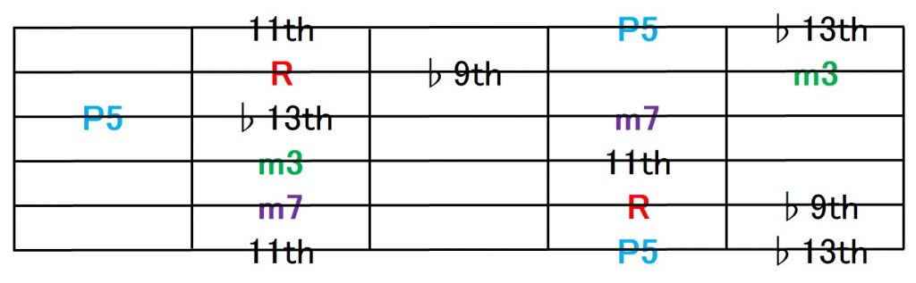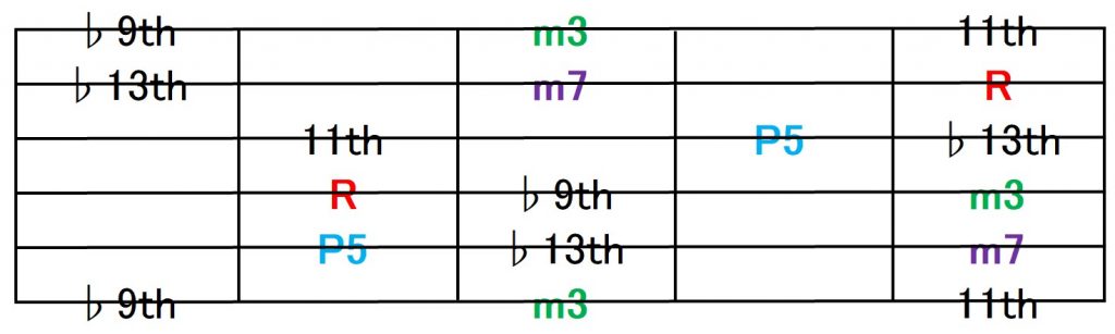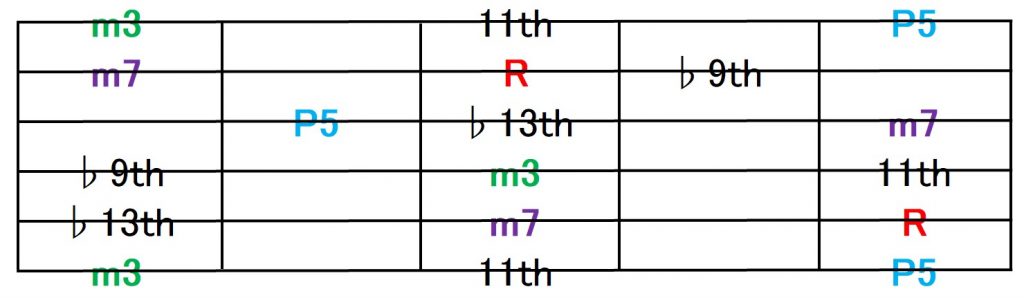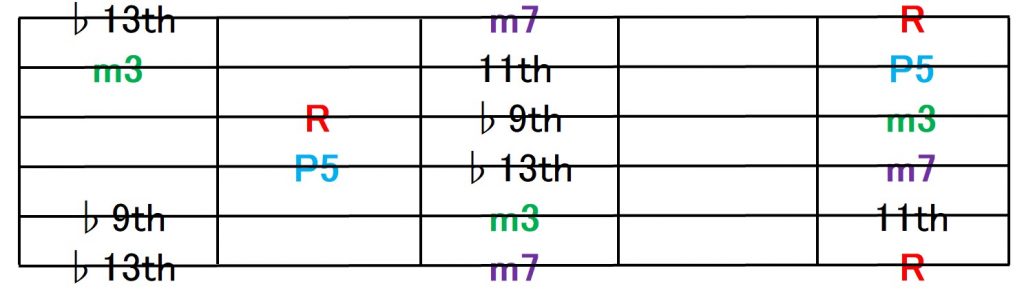 この記事では3度マイナーセブンスコードのコードトーンを7ポジションに分けて記載しています。