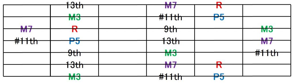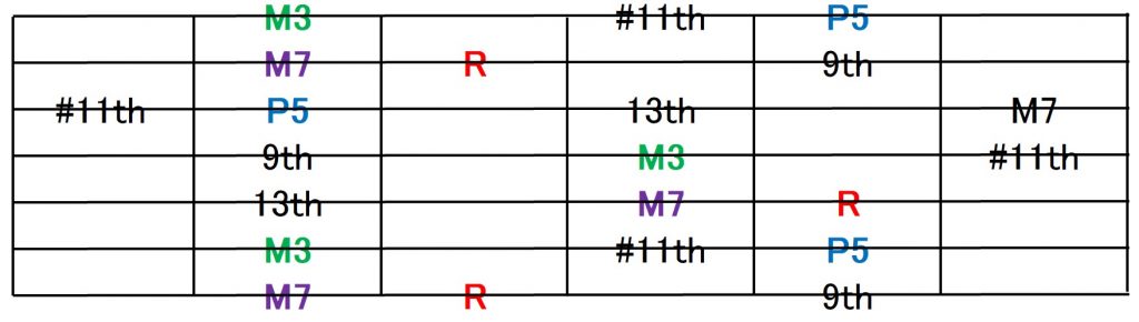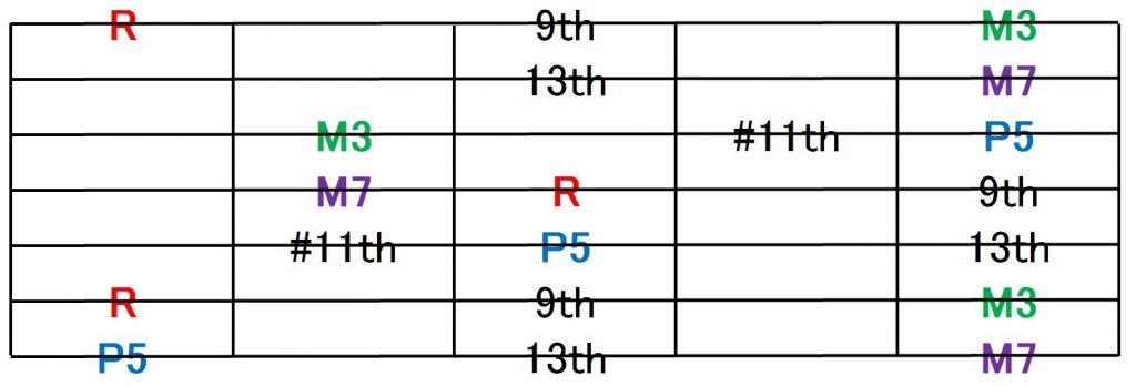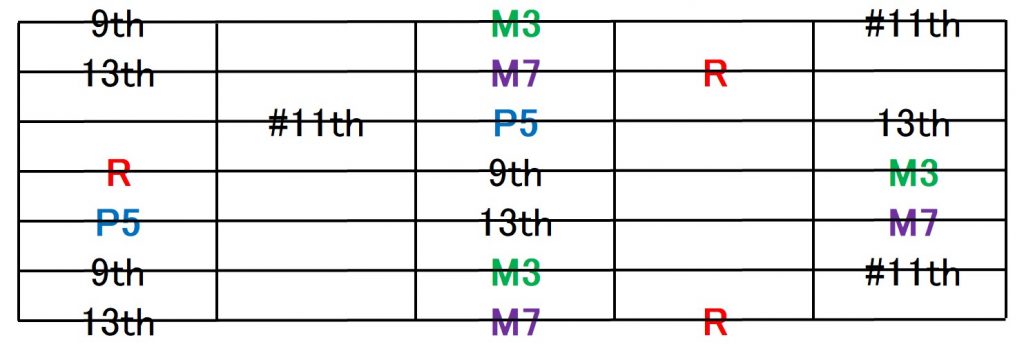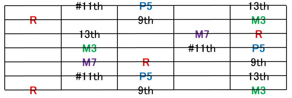 この記事では7弦ギターで4度メジャーセブンスコードのコードトーンを7ポジションに分けて記載しています。