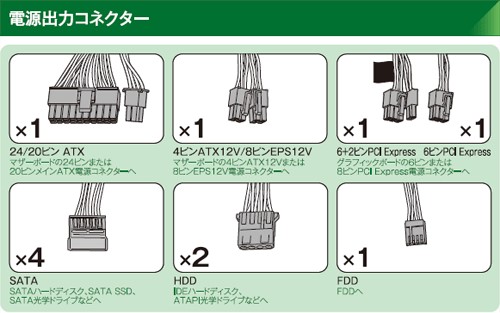 | 電源ケーブル | ATX 20+4P、ATX 4+4P、PCIe 6+2P×4、SATA×8、HDD×6、FDD |