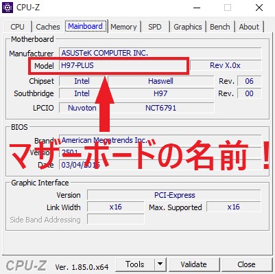 この画像で囲っている部分がマザーボードの名前です。