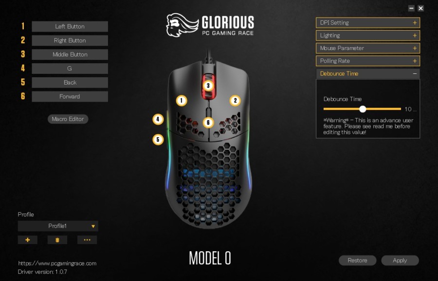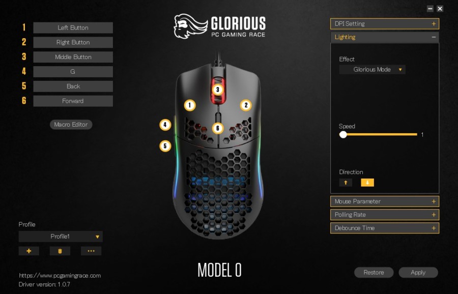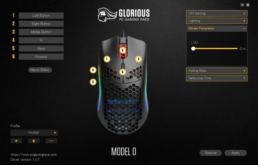 専用のソフトウェアである「GLORIOUS MODEL 0 SOFTWARE」を使う事でDPIやボタンの割り当てなど、細かい設定を行う事が出来ます。