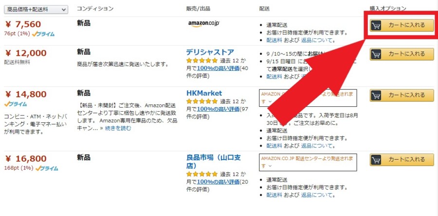 ここでAmazonが出品している適切な価格の物を探して「カートに入れる」をクリックすれば購入出来ます。