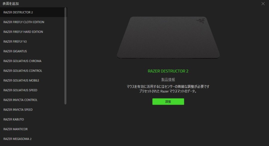 「表面を追加」の設定に入るとマウスパッドの一覧が表示されて、ここで選択したマウスパッドに最適なセンサー設定にする事が可能です。