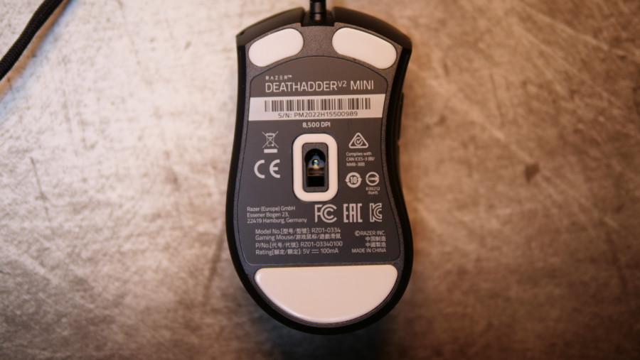 「DeathAdder V2」では底面にボタンが一つ付いていましたが、「DeathAdder V2 Mini」では付いていません。