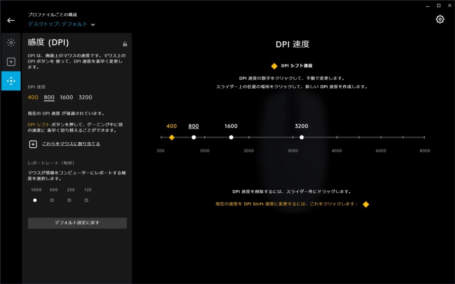 また最大5つの設定を保存しておいて、DPIボタンで切り替えて使う事も出来ます。