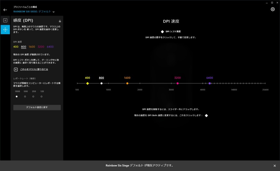 そしてDPIの設定では「100~25600DPI」の間で5つを設定しておけます。